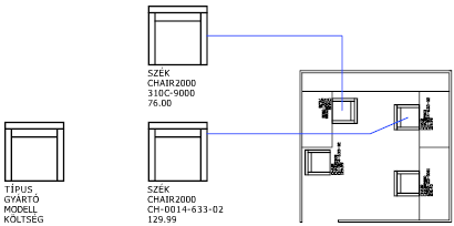 A következő ábrán látható „szék” blokk négy attribútummal rendelkezik: típus, gyártó, modell és költség. Mivel a címkék változókként lettek beállítva, mindegyik beillesztett blokkreferenciához hozzáadhatja az egyes példányokhoz kapcsolódó információkat.