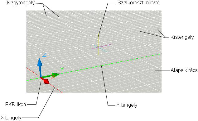 - Talajsík. Amikor a perspektivikus vetítés be van kapcsolva, akkor az FKR XY síkja egy színátmenetes alapsíkként jelenik meg. Az alapsík egy átmenetet jelenít meg az alapsík horizont és az alapsík origó között.