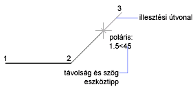 A mutató mozgatása közben, amikor a mutató a megadott polárszögek közelében van, illesztési útvonalak és eszköztippek jelennek meg. Alapértelmezésben a szög mértéke 90 fok. Az objektum megrajzolható az illesztési útvonal és az eszköztippek használatával. Használhatja a Poláris követést a Metsző és a Látszólagos metszéspont tárgyraszterekkel annak érdekében, hogy meghatározza a poláris illesztési útvonal és más objektumok metszéspontját.