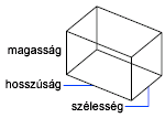 Megadott hosszúságú, szélességű és magasságú téglatestet hoz létre. Ha értékeket ad meg, akkor a hossz az X tengelynek, a szélesség az Y tengelynek, és a magasság a Z tengelynek felel meg. Ha egy pontot választ ki a hossz megadásához, akkor egyúttal megadja az XY síkban történő elforgatást is.