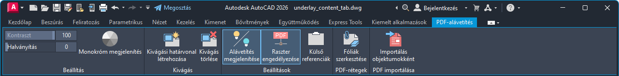 Amikor kiválaszt egy PDF-alávetítést, a szalagon megjelenik a PDF környezetfüggő lap.