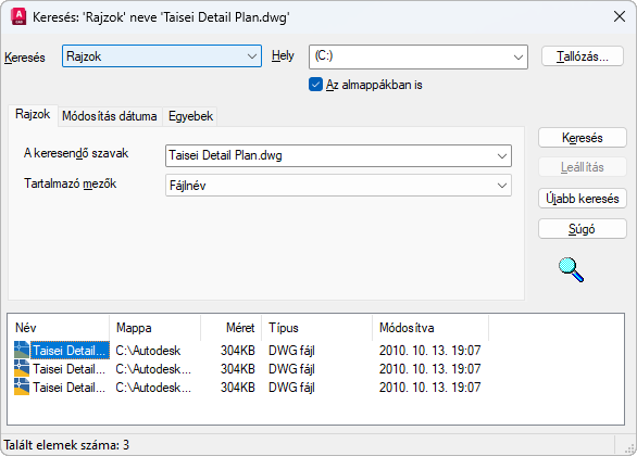 Megadja a keresendő tartalom típusát. A megadott tartalomtípus határozza meg, hogy a Keresés párbeszédpanel milyen lapjai és milyen keresési mezői jelennek meg. A Módosítás dátuma és az Egyebek lap csak akkor jelenik meg, ha a Keresés listában a Rajzok opció választotta.