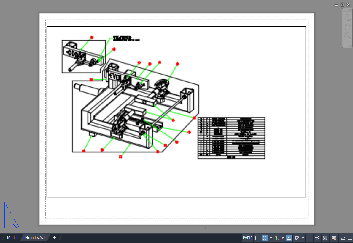 - A rajz nyomtatáshoz végzett előkészítéséhez váltson papírtérre. Itt különböző elrendezéseket állíthat be címpecsétekkel és megjegyzésekkel; és mindegyik elrendezésen elrendezési nézetablakokat hozhat létre, amelyek a modelltér különböző nézeteit jelenítik meg. Az elrendezési nézetablakokban a papírtérhez képest léptékezi a modelltérbeli nézeteket. A papírtérben egy mértékegység a papírlapon mért tényleges távolságot jelzi, attól függően, hogy az oldalbeállításban millimétert vagy hüvelyket adott-e meg.
