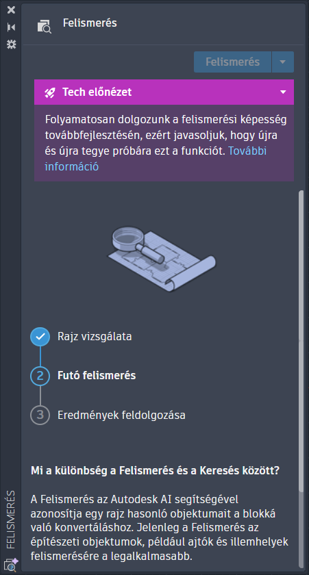 A Felismerés paletta beállításokat kínál a rajz vizsgálatához és a felismert objektumok áttekintéséhez a blokk-konvertálás előtt.