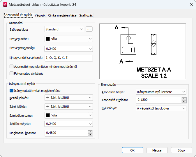 A metszetvonal végén használandó nyílfej típusát állítja be.