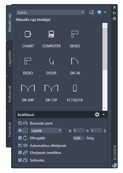 Eszközpaletták – Az Eszközpaletták ablak akkor ajánlott, ha sokféle blokkot használ. Több lap is elérhető, és egyéni lapok is létrehozhatók a kapcsolódó blokkok csoportjai és speciális eszközök számára. Az eszközpalettákról blokkokat szúrhat be a blokkeszköz rajzra való áthúzásával, illetve a blokkeszközre kattintással, majd a beszúrási pont megadásával. Az Eszközpaletták ablak az ESZKÖZPALETTÁK paranccsal érhető el.