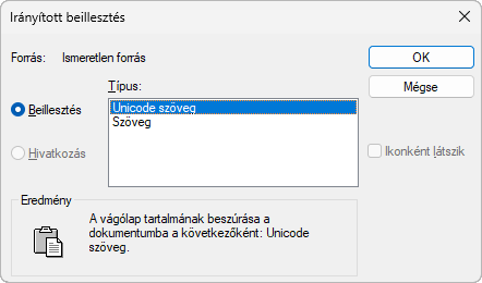Megjeleníti a lehetséges formátumokat, amelyekben a vágólap tartalmát beillesztheti a jelenlegi rajzba.