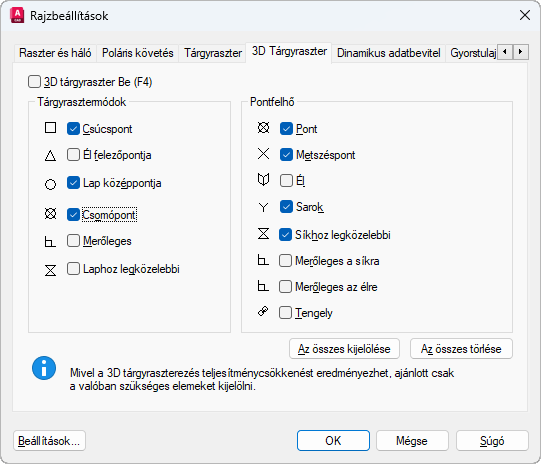 A 3D tárgyraszterek be- és kikapcsolása. A 3D tárgyraszter módok területen kiválasztott egyes tárgyraszterek aktívak, amíg a 3D tárgyraszter be van kapcsolva. (3DOSMODE rendszerváltozó)