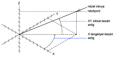 A -NÉZŐPONT használatával elforgathatja a nézetet. Az alábbi ábrán a VKR X tengelyéhez és XY síkjához viszonyított két szög által meghatározott nézet látható.