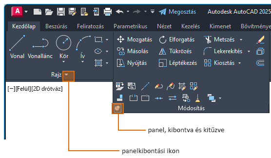 A paneleket a szalaglapról áthúzhatja a rajzterületre vagy egy másik képernyőre. A lebegő panel mindaddig nyitva marad, amíg vissza nem húzza azt a szalagra. A panel még akkor sem zárul be, ha esetleg másik szalaglapot aktivál.
