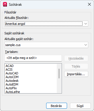 Az aktuális saját szótár nevét jeleníti meg. AzAutoCAD-ben a saját szótárak kiterjesztése .cus.