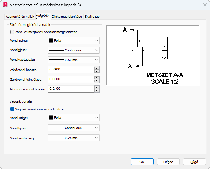 Beállítja a metszetvonalak által használt záró- és hajlítási vonalak, valamint a síkvonalszakaszok tulajdonságait.