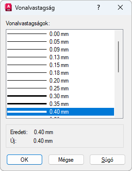 Az alkalmazható vonalvastagságok megjelenítése. A rendelkezésre álló vonalvastagságok olyan rögzített értékekből állnak, amelyek a leggyakrabban kerülnek alkalmazásra a rajzokban. Válasszon egy alkalmazni kívánt vonalvastagságot.
