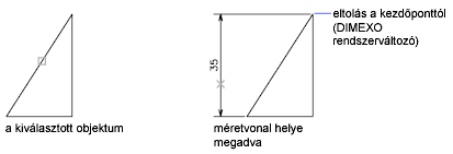 Ha egyenest vagy ívet választ ki, a program az egyenes vagy az ív végpontjait használja a segédvonalak kezdőpontjaiként. A méret-segédvonalak eltolhatók az Új méretstílus, a Méretstílus módosítása és az Aktuális stílus felülírása párbeszédpanelek Vonalak és nyilak lapján található Eltolás a kezdőponttól mezőben megadott távolsággal. További információt a MÉRETSTÍLUS parancsnál talál. Ezt az értéket a program a DIMEXO rendszerváltozóban tárolja.