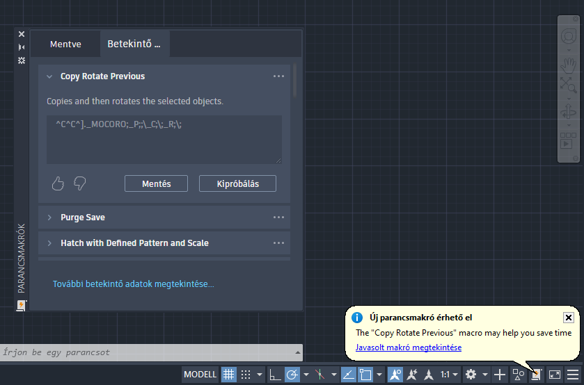 Ezek a betekintő adatok az Ön által használt adott parancssorozatok használati gyakorisága alapján jönnek létre és érnek el Önhöz. Ha például a MÁSOL paranccsal másol objektumokat, majd a FORGAT paranccsal forgat el objektumokat, akkor a MÁSOL,FORGAT parancssorozatot használja. Amikor parancsokat használ a termékben, a rendszer kiértékeli a parancssorozatokat, hogy van-e hozzájuk megfelelő parancsmakró-javaslat.
