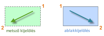 Néha számos objektumot kell kijelölnie. Ahelyett, hogy egyesével választaná ki az objektumokat, kijelölheti egy terület objektumait, ha egy üres helyre kattint (1), a mutatót jobbra vagy balra mozgatja, majd másodszor is kattint (2).