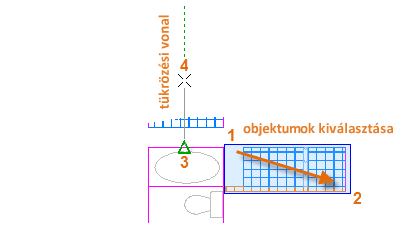Az alábbi példában indítsa el a TÜKRÖZ parancsot (vagy írja be a TÜ karaktereket a Parancs ablakba), ablak megadásával (1 és 2) jelölje ki a geometriát a jobb oldali falon, nyomja le az Enter vagy a Szóköz billentyűt, majd adja meg a fürdőszoba középvonalának megfelelő tükrözési vonalat (3 és 4).