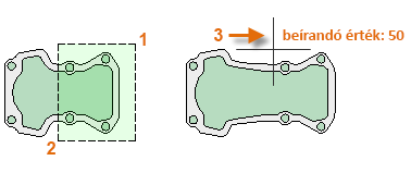 Használja a NYÚJT parancsot (vagy írja be az NY karaktereket a Parancs ablakba), és jelölje ki az objektumokat metsző kijelöléssel az alább látható módon (1 és 2). A metsző kijelölés kötelező – csak a metsző kijelölés által metszett geometriát nyújtja a program. Ezután kattintson bárhová a rajzban (3), mozgassa jobbra a mutatót, majd adja meg az 50 értéket a távolságként. Ez a távolság millimétert vagy lábat jelölhet.