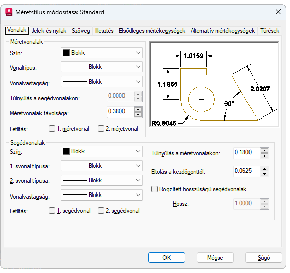 A méretstílusok segítségével vázlatolási szabványokat adhat meg és alkalmazhat. A MÉRETSTÍLUS paranccsal számos méretezési rendszerváltozót megadhat, így lényegében a méret megjelenésének és viselkedésének minden elemét vezérelheti. Minden méretstílusban mentve lesznek ezek a beállítások.