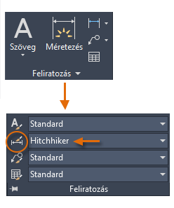 Az aktuális méretstílus neve (ami ebben az esetben Hitchhiker (Stoppos)) a Feliratozás panel legördülő listájában is megjelenik.