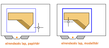 Amikor egy elrendezés lapon dolgozik, anélkül válthat a papírtér és a modelltér között, hogy vissza kellene térnie a Modell lapra. A módszer a következőképpen működik: Ahogy az ábrán látható, a modelltérbe történő belépéshez vigye a mutatót egy elrendezési nézetablakra, majd kattintson bele duplán. A papírtérbe történő visszalépéshez pedig kattintson duplán az elrendezési nézetablakon kívül. A modelltérben az elrendezési nézetablak széle vastagabbá válik.
