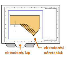 Az alábbi ábrán egy elrendezés lap kiválasztásának példája látható. Jelenleg csak két objektum van a papírtérben: a cím és a rajzhatár blokkreferenciája, és egyetlen elrendezési nézetablak, amely a modelltér egyik léptékezett nézetét jeleníti meg.
