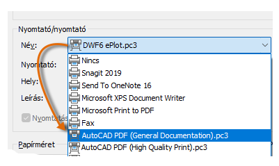 A Nyomtató legördülő listából válassza az AutoCAD PDF (General Documentation).pc3 lehetőséget: