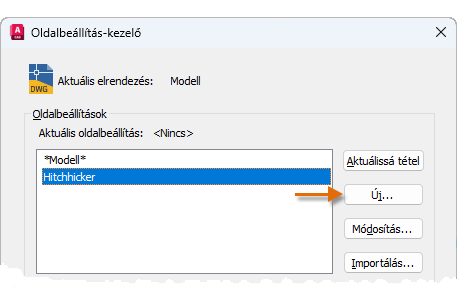 Az Oldalbeállítás-kezelő megnyitásához kattintson a jobb gombbal a Modell lapra vagy egy elrendezési lapra, majd válassza az Oldalbeállítás-kezelő lehetőséget. A parancs a következő: OLDALBEÁLL.