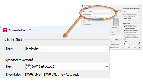 Ha készen áll a nyomtatásra, egyszerűen adja meg az oldalbeállítás nevét a Nyomtatás párbeszédpanelen, amellyel visszaállítja az összes nyomtatási beállítást. A következő illusztráción a Nyomtatás párbeszédpanelen az Útikalauz stopposoknak oldalbeállítás használata van beállítva, amely egy DWF- (Design Web Format-) fájlt fog létrehozni a nyomtatás helyett.