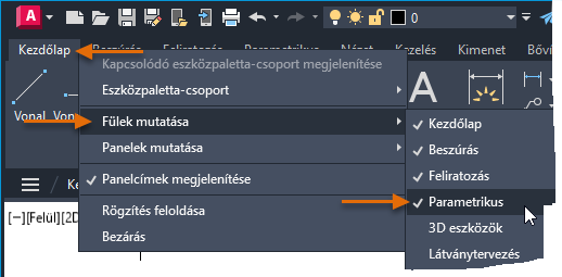 2. Kattintson a jobb gombbal bármelyik lapra a szalagon, majd válassza a Fülek mutatása > Parametrikus lehetőséget.