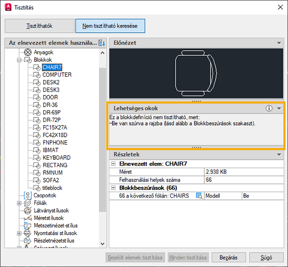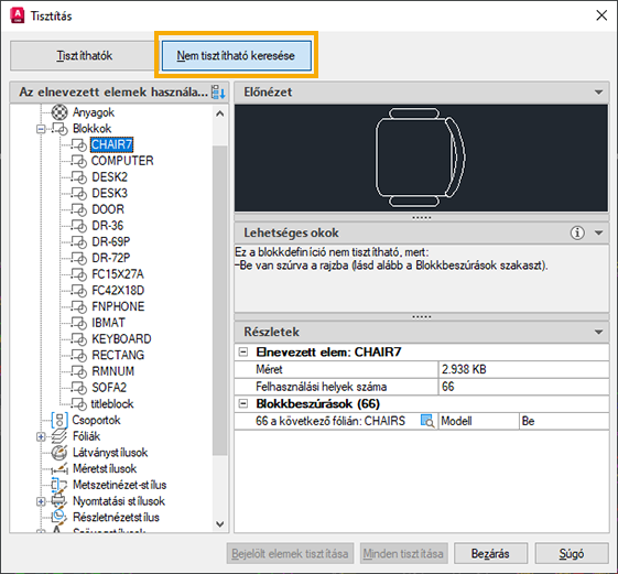 Lehet, hogy tisztítani szeretne egy elemet, de az nem jelenik meg a Nem használt elnevezett elemek listáján. A Nem tisztítható elemek keresése listán megtekintheti azokat az elnevezett elemeket, amelyek használatban vannak a rajzban.