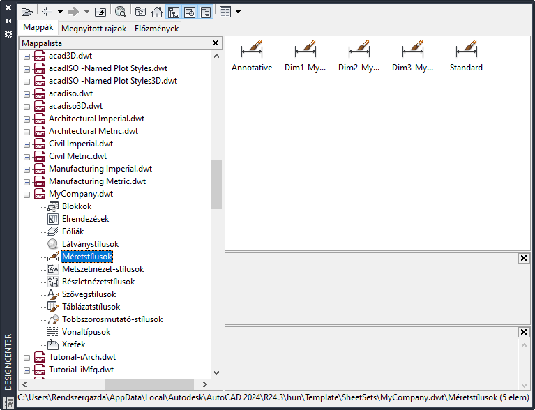 Megjelennek a rajzban vagy a sablonban definiált méretstílusok.