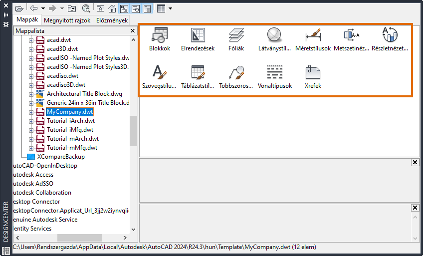 Tegyük fel, hogy importálni kíván néhány méret-, szöveg- és táblázatstílust a frissített vállalati sablonból. Ezek a stílusok a rajz létrehozása után kerültek a sablonba, így nem lettek beolvasva abból. Ebben a példában a DesignCenter használatával importálunk néhány stílust.