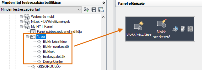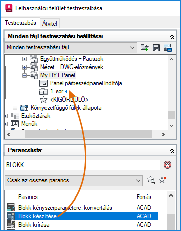 2. A Parancslista panel Keresés a parancslistában szövegmezőjébe írja be a következőt: blokk. Jelölje ki a Blokk készítése (BLOKK parancs) lehetőséget, és húzza a My HYT Panel 1. sorába.