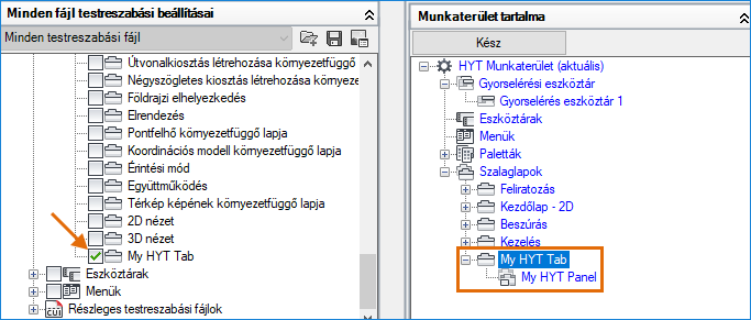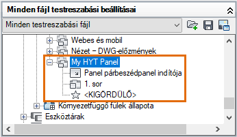 1. Szükség esetén keresse meg a CUI-szerkesztőben az újonnan létrehozott szalagpanelt (My HYT Panel).
