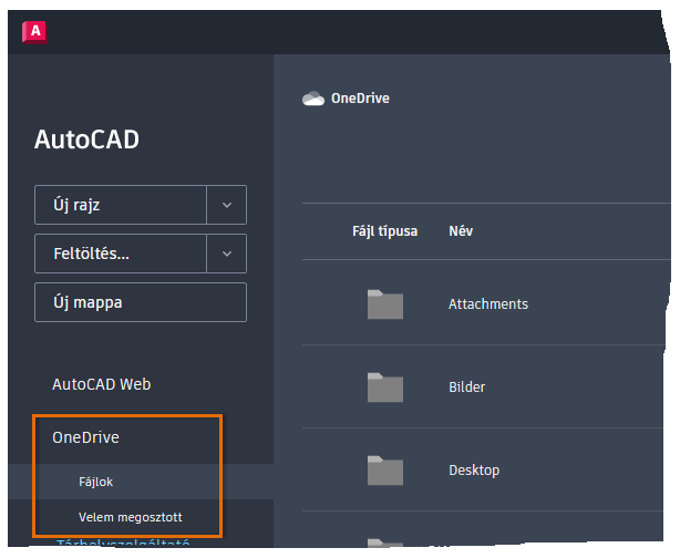 Megjegyzés: Az AutoCAD webes alkalmazásban létrehozott, külső felhőalapú tárhelyre mentett rajzok az AutoCAD asztali alkalmazásban is elérhetők. A felhőben tárolt fájlok eléréséhez szükség lehet további alkalmazás (például Dropbox vagy OneDrive asztali alkalmazás) telepítésére. A telepítést követően hozzáférhet a felhőtárhelyfiókban tárolt fájlokhoz, például a helyi vagy a hálózati meghajtón lévő fájlokhoz. Ha rendelkezik AutoCAD 2020-alapú asztali termékkel, használhatja az új, integrált, külső, felhőalapú tárhelyeszközöket.