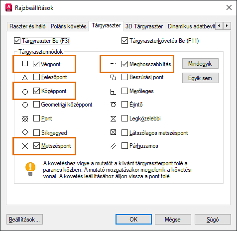Az OSMODE alapértelmezett értéke 4133. Elsőként azt veheti észre, hogy a 4133 nem szerepel értékként a táblázatban. Ez azért van, mert az OSMODE értéke az alapértelmezett futó tárgyraszterek összege, ahogyan az a párbeszédpanelen látható.