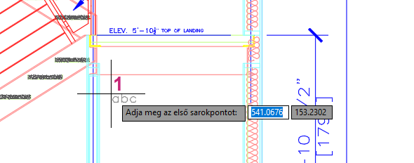 8. A rajzterületen adja meg a BSzöveg befoglaló téglalapjának első sarokpontját (1) a lépcső alatti területen.