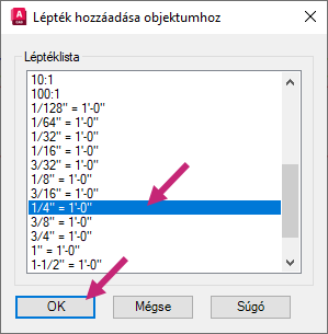 5. A Léptékek hozzáadása objektumhoz párbeszédpanelen válassza ki az 1/4"-1'-0" léptéket a listából, és kattintson kétszer az OK gombra a feliratléptékek hozzáadásához.