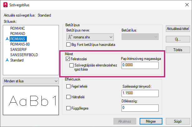 A feliratozási szövegstílusok nem szükségesek a feliratozási szövegek létrehozásához, de a segítségükkel leegyszerűsíthető a folyamat, csakúgy, mint a nem feliratozási szövegstílusok esetében. A feliratozási és a nem feliratozási szövegstílusok között a legfőbb különbség a Feliratozási tulajdonság. Ha a Feliratozási tulajdonság engedélyezve van, és a stílus aktuális, akkor minden létrehozott szöveg feliratozási szöveg lesz. A Papírtéri szövegmagasság tulajdonság meghatározza a szöveg végleges magasságát, míg a Szövegtájolás elrendezéshez igazítása tulajdonság azt definiálja, hogy a szöveg annak az elrendezésnek és nézetablaknak a tájolásához igazodjon-e, amelyben megjelenik.