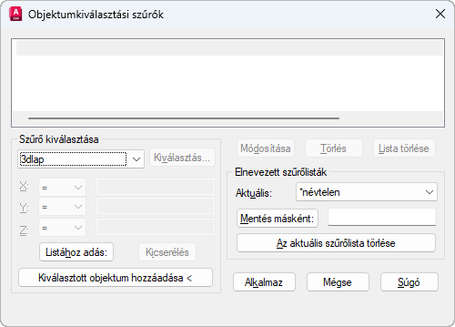 Kilép a párbeszédpanelből és megjeleníti az Objektumok kiválasztása promptot, ahol létrehozhat egy kiválasztási halmazt. Az aktuális szűrő a kiválasztott objektumokon kerül alkalmazásra.