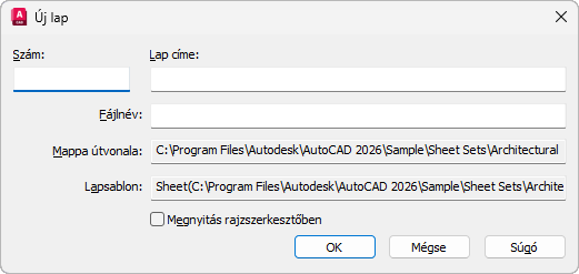 Létrehoz egy új lapot az aktuális lapkészletben úgy, hogy létrehoz egy olyan rajzfájlt (DWG), amely tartalmaz egy, a rajzéval megegyező nevű elrendezés címkét.