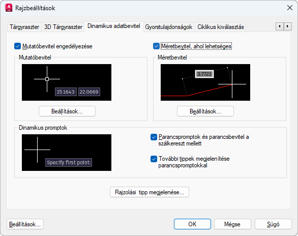 Mutatóbevitel, méretbevitel, dinamikus promptok és rajzolási tipp megjelenítése beállítások vezérlése.