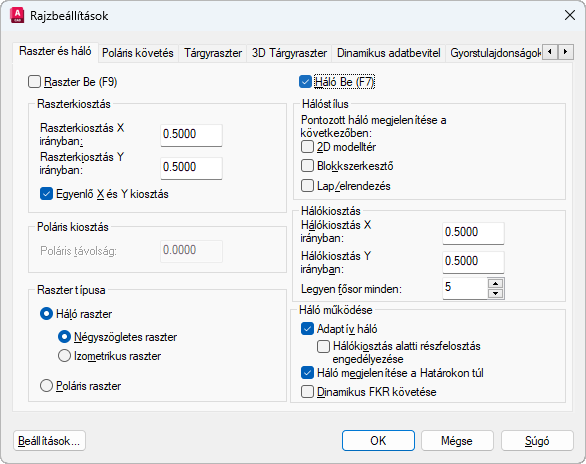 A raszter típusát Hálóra állítja be. Ha pontokat határoz meg, az egérmutató függőleges vagy vízszintes hálópontok mentén illeszkedik. (SNAPTYPE rendszerváltozó)