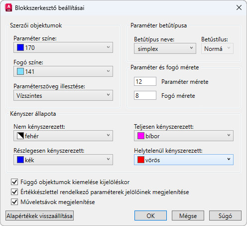 Paraméter és fogó objektumok színét szabályozza, továbbá megadja a paraméterszöveg tájolását.