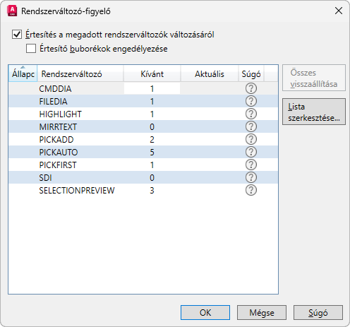 Megjegyzés: Ha a listához való hozzáadás előtt módosította a rendszerváltozót, a Kívánt érték az aktuális értéket fogja megjeleníteni (nem a kezdeti értéket).
