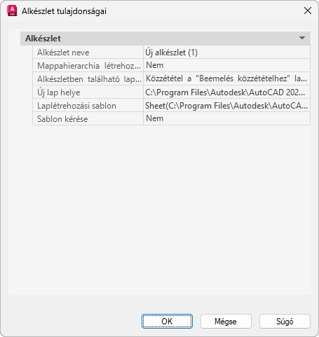 Megadja azt a rajzsablonfájlt (DWT) és elrendezésnevet, amelyet ebben az alkészletben az új rajzfájlok létrehozásához használunk.
