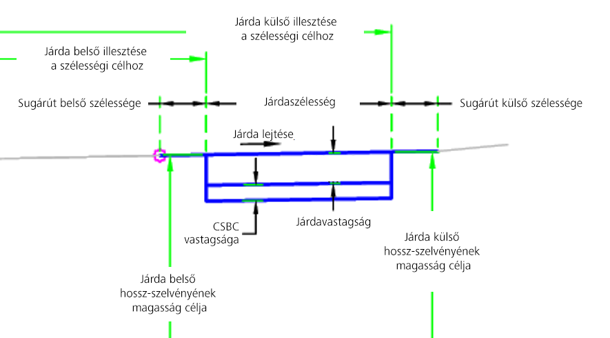 | Járda belső hossz-szelvénye | Ezzel felülbírálható a járda belső magassága. A szélesség megadása a következő objektumtípusok esetén lehetséges: nyomvonalak, vonalláncok, vezérlővonalak és földmérési alakzatok. | Választható |