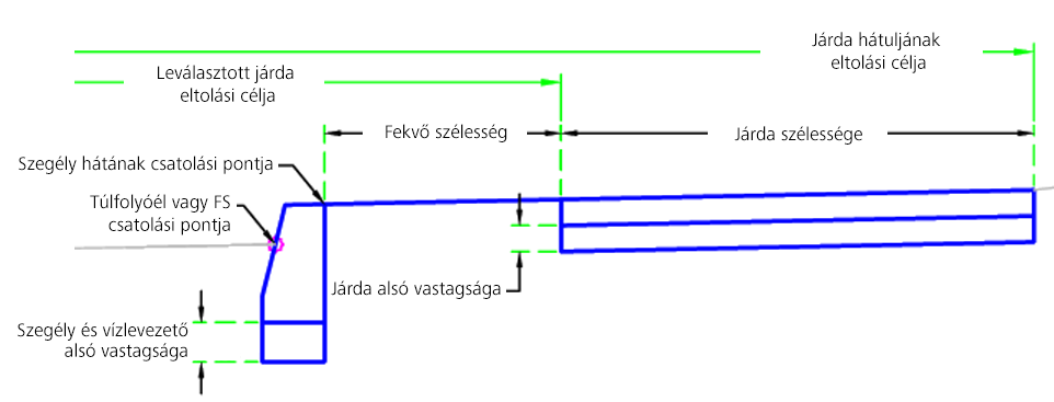 Ha a járda típusa nem Nincs értékű, akkor a rendszer az ennek megfelelő járdát és alapot hozza létre. Ha a járda típusa Leválasztott, és a Leválasztott járda eltolása van megadva, akkor a járda belső éle módosul. Ha a Járda hátuljának eltolása van megadva, akkor az összes járdatípus szélessége módosul.
