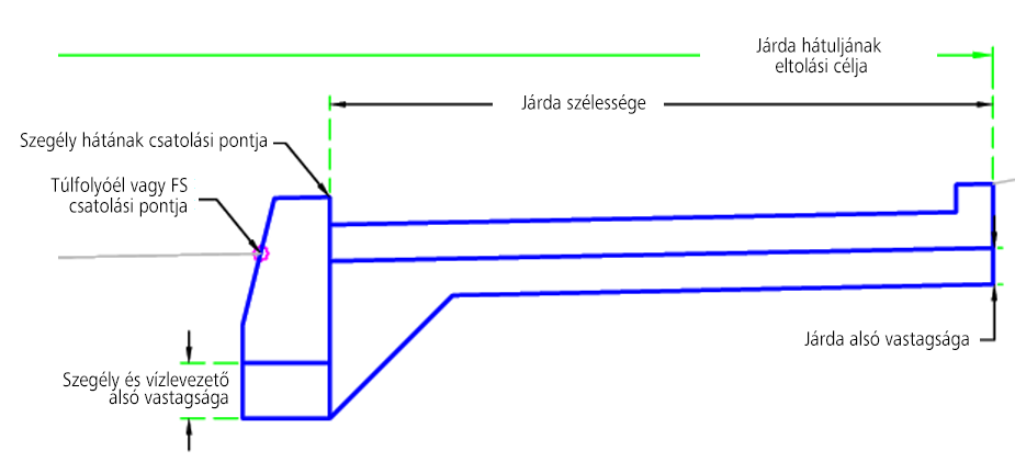 | Járda hátuljának eltolása | A rögzített járdaszélesség felülírására és a külső járdaél egy eltolási nyomvonalhoz való kötésére használható. A szélesség megadása a következő objektumtípusok esetén lehetséges: nyomvonalak, vonalláncok, vezérlővonalak és földmérési alakzatok. | Választható |